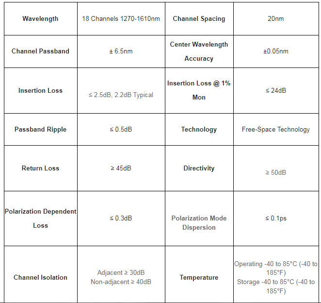 Based on Free-Space technology, this CWDM Mux Demux provides ultra low insertion loss for extending maximum distance of CWDM links and allows 18 parallel and independent data streams over pair of single-mode optical fibers.